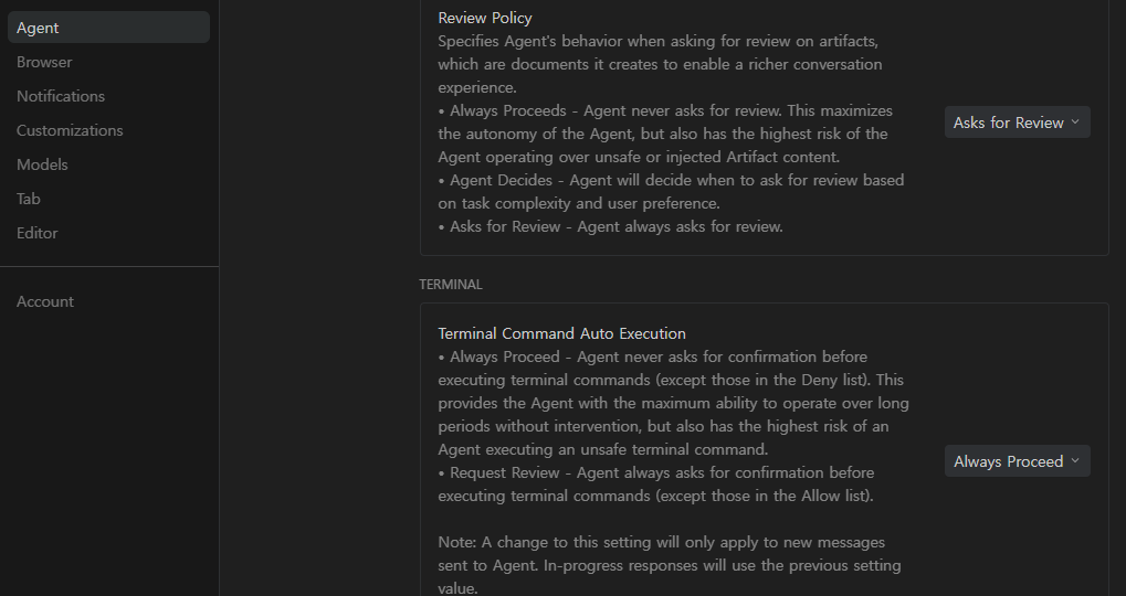 - Agent의 Terminal Command Auto Execution을 Always Proceed로 놓기
